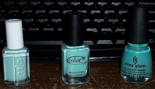 For today's post, the comparison is between Essie's Mint Candy Apple, Color Club's Bue-Ming, and China Glaze's Aquadelic. Here's the bottle pic.